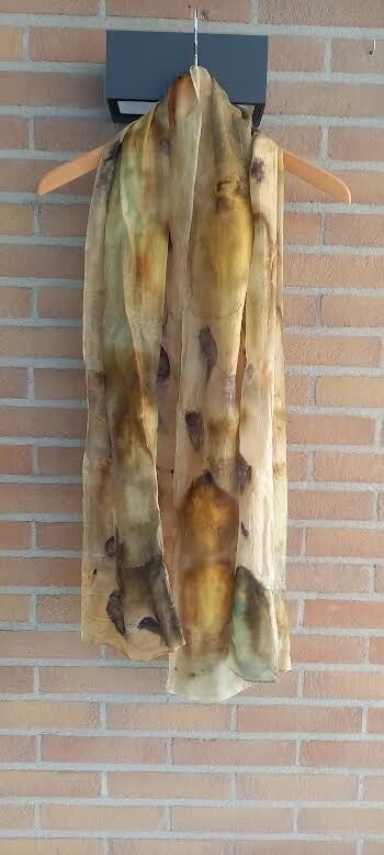Deze zijde sjaal is gemaakt met de ambachtelijke techniek van het ecoprinten. Ieder item is daarom uniek. Zorgvuldig verpakt en klaar om verstuurd te worden.